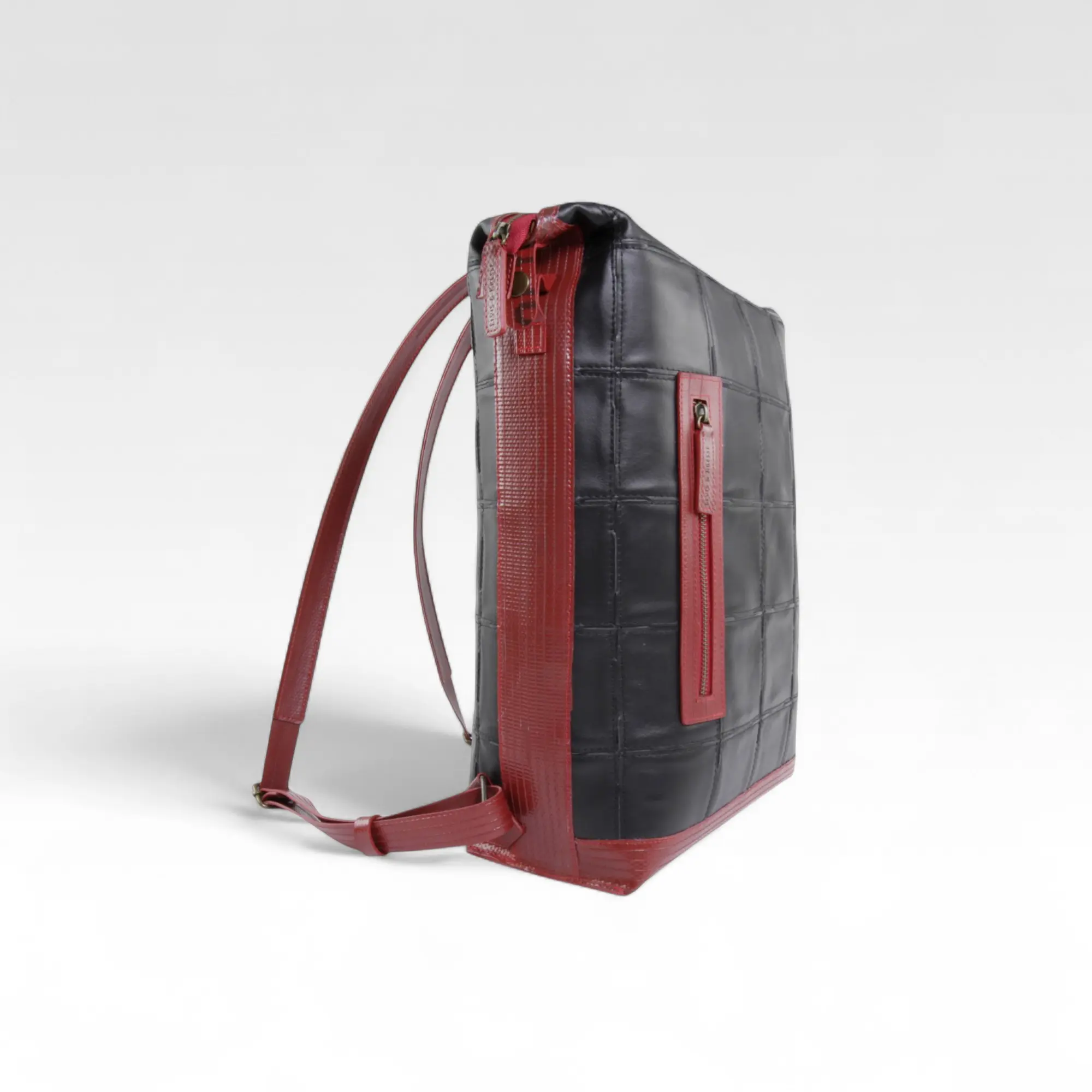 The Large Leather Backpack has two adjustable straps made from genuine decommissioned fire-hose, a body made from rescued Burberry leather and a reclaimed lining. It has a quick access external zip pocket, and two internal pockets - one perfect for a small laptop or important documents with a stud closure and the other for your day-to-day essentials with a zip.